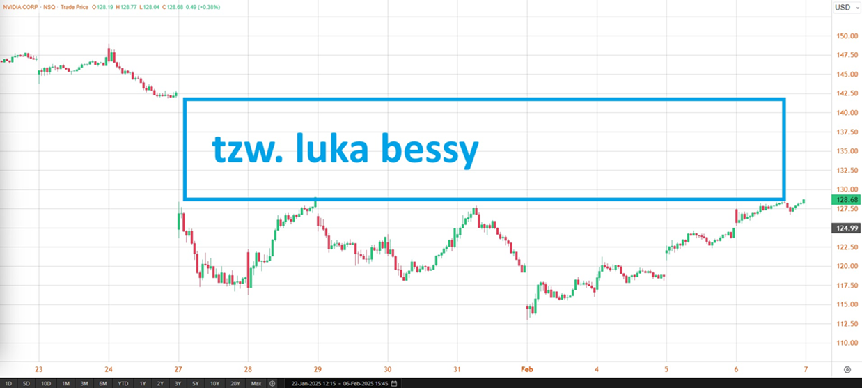 Przedstawiona na wykresie 1 luka bessy oznacza, że pomiędzy piątkowym zamknięciem 27 stycznia po cenie 142,60$ a poniedziałkowym otwarciem po 124,80$ na standardowym rynku nie zawierano transakcji. Notowania 27 stycznia wahały się pomiędzy 128,40 a 116,70 USD za 1 akcję. Kurs na czwartkowe zamknięcie 7 lutego wynosił już 128,68 USD. Co za tym idzie „szybkość reagowania” i składania zleceń akurat w tym wypadku na niewiele się zdała. Oczywiście nie wiemy co będzie dalej i w którą stronę będzie podążał kurs.