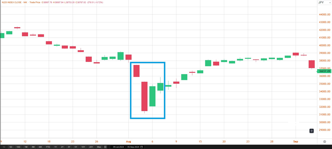 Wielokrotnie opisywaliśmy, analizowaliśmy i przedstawialiśmy badania rynkowe, że gra tzw. „timingiem” nie popłaca. Przyjrzyjmy się czym ona może skończyć się u zbyt „nerwowego/emocjonalnego” lub jak kto woli „szybkiego” inwestora. W sierpniu 2024 roku (Wykres 2) na japońskiej giełdzie nastąpił szybki dwudniowy krach. Załóżmy, że reagujemy „szybko” i składamy zlecenie umorzenia funduszu inwestycyjnego japońskich akcji nawet niezwłocznie po rozpoczęciu przecen czyli w dniu 2 sierpnia (piątek) po godzinie 1:00 polskiego czasu. Oznacza to, że realizacja zlecenia nastąpiła następnego dnia roboczego przy poziomie indeksu Nikkei 225 31.458 punktów. Od piątkowego otwarcia do poniedziałkowego zamknięcia (5 sierpnia 2024 roku) straciliśmy, więc -16%. Trzymając alokację na ten indeks do dnia dzisiejszego (tj. 7 lutego 2025 roku) bylibyśmy na plusie. Baaa! Nawet po ośmiu sesjach giełdowych odrobilibyśmy hipotetyczne straty.