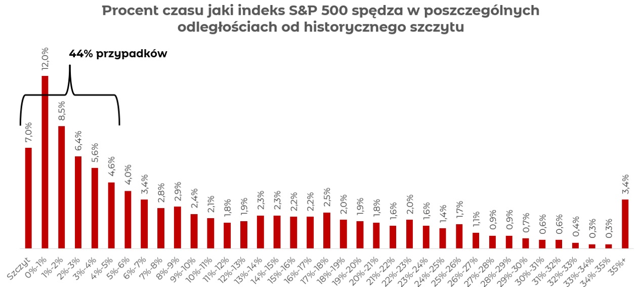 Zacznijmy od określenia na ile wyjątkowa jest obecna sytuacja, w której obserwujemy wciąż nowe szczyty indeksów. Okazuje się, że w latach 1952-2023 amerykański indeks S&P 500, spośród wszystkich dni sesyjnych, aż 7% czasu wyznaczał historyczne szczyty! Innymi słowy, nowy najwyższy w historii poziom indeksu pojawiał się średnio co ok. 3 tygodnie. Co więcej, gdy wziąć pod lupę jak często ceny znajdowały się maksymalnie 5% od szczytu, było to aż 44% czasu. Notowania odbywają się najczęściej właśnie w tych obszarach, skupionych blisko najwyższych poziomów. Jeżeli więc mielibyśmy z samego tylko faktu relatywnie wysokich poziomów cenowych przerywać inwestycję na rynku akcyjnym, spędzilibyśmy dużo czasu poza nim. Sprawdźmy zatem, czy taka strategia się opłaca.