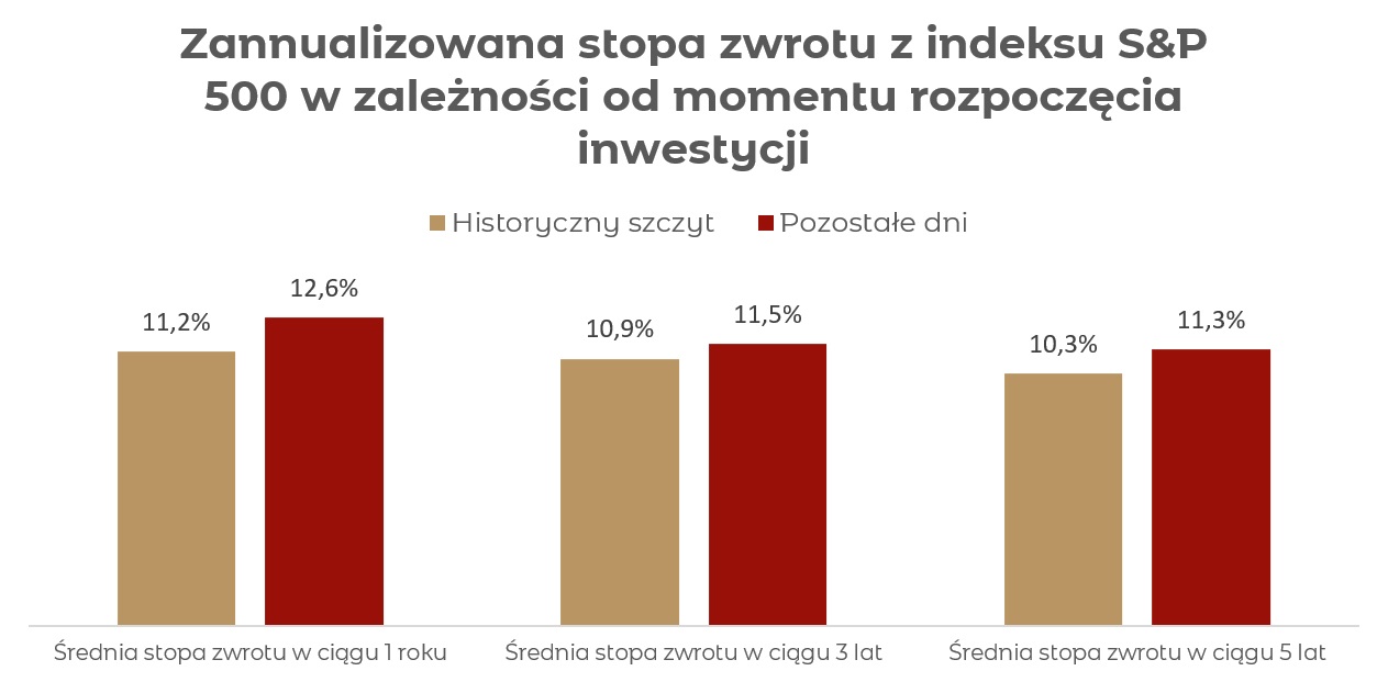 Przeanalizujmy jakie stopy zwrotu osiągnie inwestor, który rozpoczyna swoją inwestycję wyłącznie w tych dniach, kiedy indeks S&P 500 notuje historyczne szczyty. Jeżeli warto w takich momentach ewakuować się z akcji (lub wstrzymać się z ich nabyciem), to teoretycznie stopy zwrotu powinny być ujemne. Rzeczywistość okazuje się zupełnie inna. Inwestując na szczytach, statystycznie nie tylko nie ponieślibyśmy straty w perspektywie 1, 3 oraz 5 lat, ale wręcz zarobilibyśmy niemal tyle samo, co rozpoczynając inwestycję w pozostałych dnia sesyjnych!