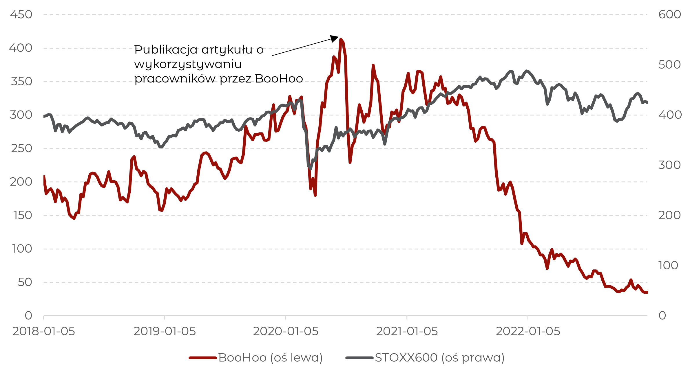 Podobnie jak w przypadku koncernu BP, kurs akcji BooHoo nie powrócił do poziomów, na jakich znajdował się przed publikacją artykułu ujawniającego wykorzystywanie pracowników. Produkty spółki zostały wykluczone ze sprzedaży m.in. przez Amazon. Spółka próbuje naprawić wyrządzone szkody i powrócić na ścieżkę zrównoważonego wzrostu. Póki co, jak pokazuje kurs jej akcji, działania te nie zostały pozytywnie ocenione przez inwestorów. Odgrywająca coraz większą rolę w konsumpcji tzw. generacja Z, jest bardziej wrażliwa i wyczulona na szkodliwość społeczną. Aby odzyskać zaufanie, zarówno inwestorów jak i konsumentów, spółka musi wykonać ogromną pracę, a jej skuteczność nie jest pewna.