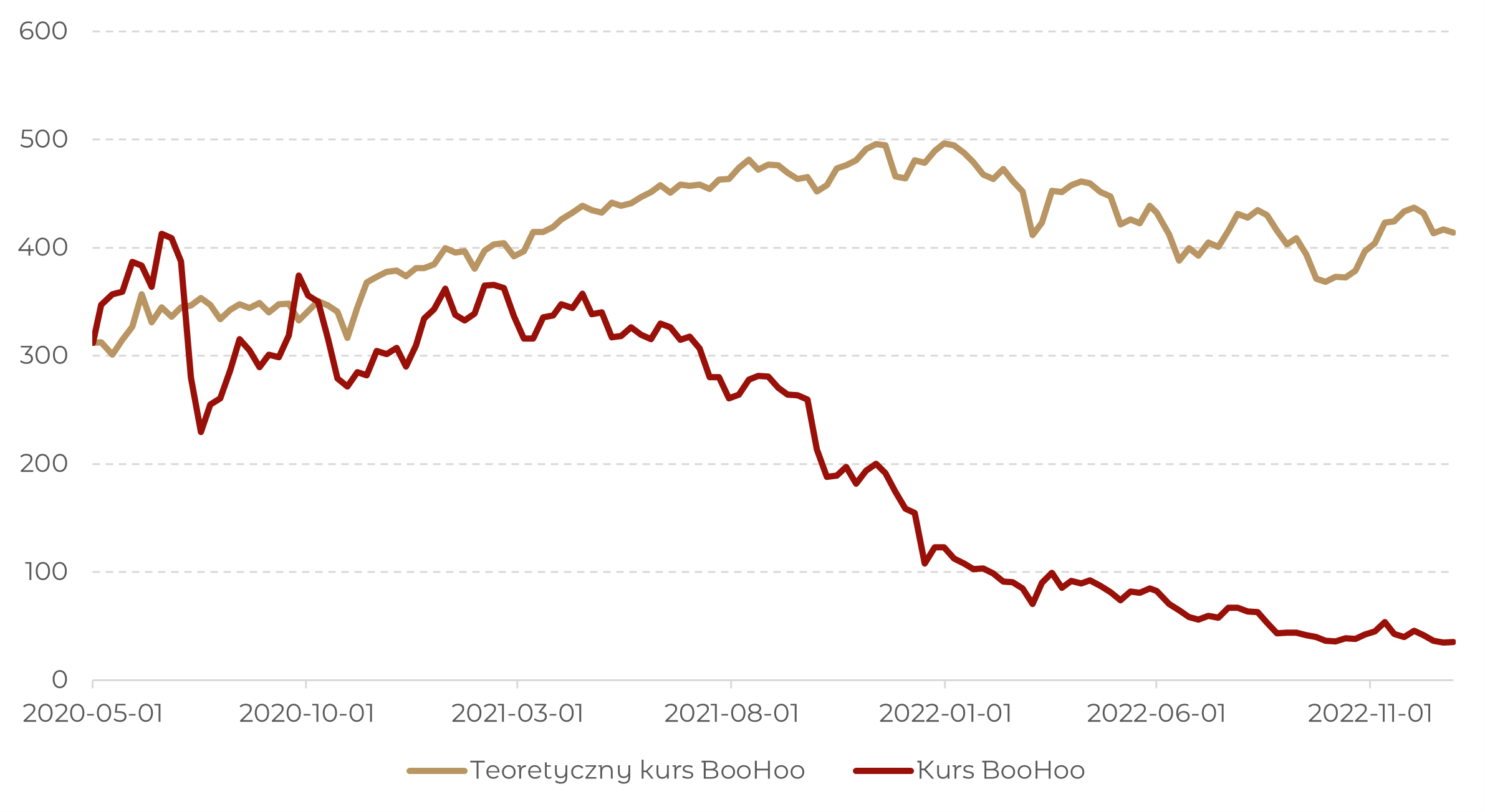 Wykres 4. Kurs akcji BooHoo i teoretyczny kurs akcji BooHoo (regresja względem Stoxx600) gdyby katastrofa się nie wydarzyła.