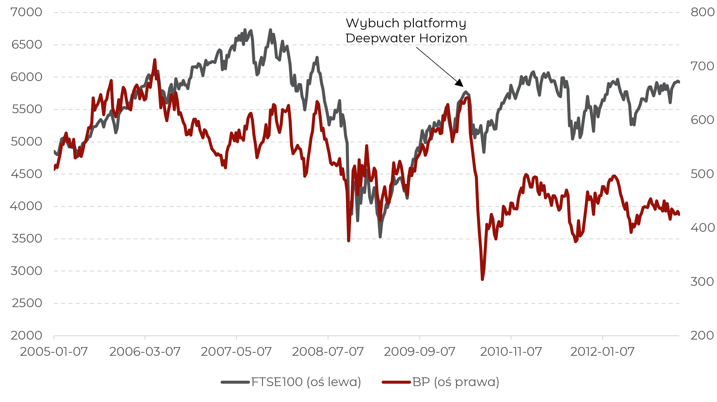 Wykres 1. Kurs akcji BP i notowania indeksu FTSE100 w latach 2005 – 2012 .