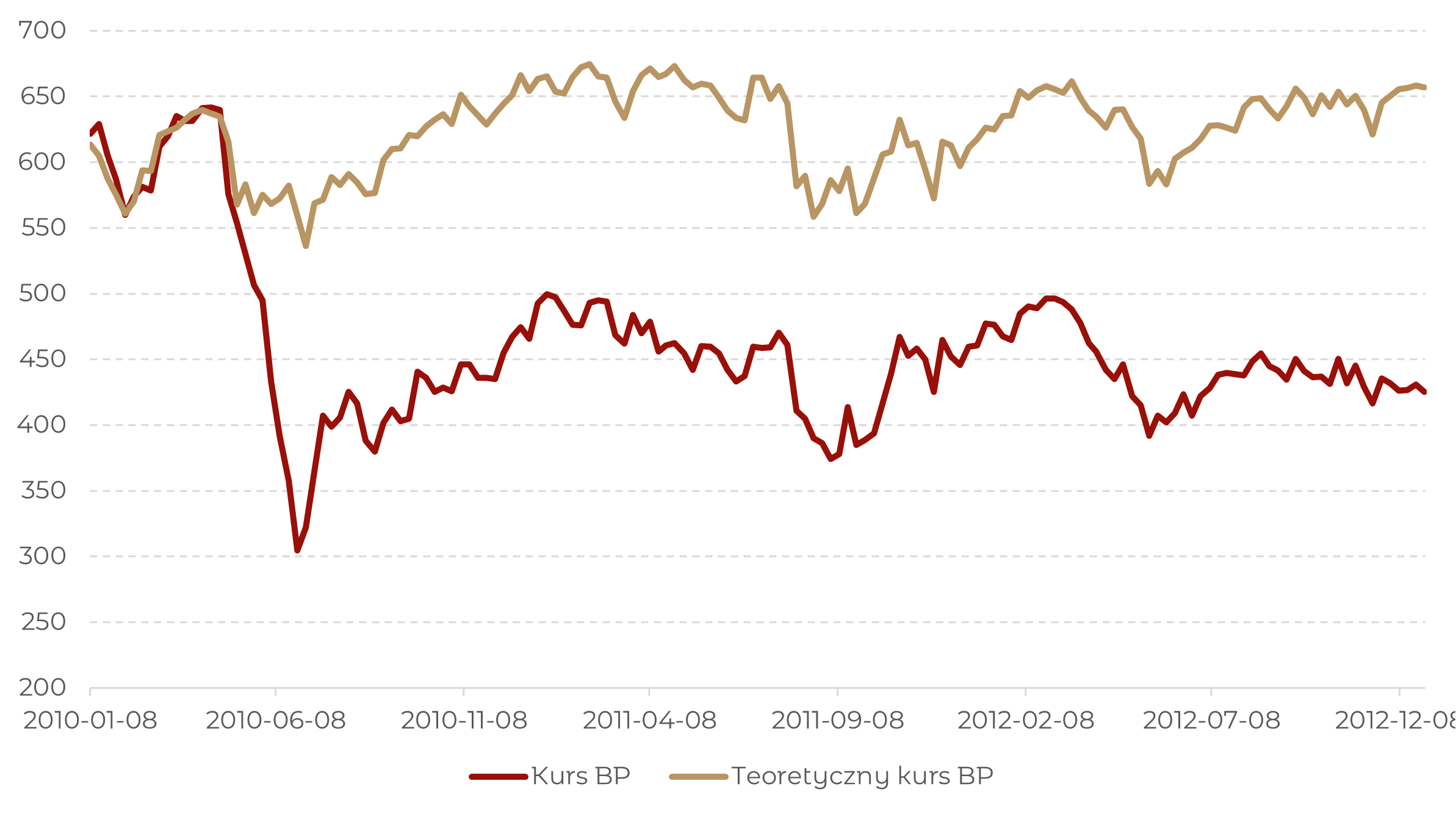 Na Wykresie 2 znajduje się symulacja zachowania kursu akcji BP, gdyby katastrofa nie miała miejsca (współczynnik beta obliczony w stosunku do indeksu FTSE100 na bazie tygodniowych obserwacji z 5 lat poprzedzających wyciek ropy). Z symulacji wynika, że zachowanie kursu akcji byłoby istotnie lepsze niż faktyczne. Zamiast spaść o 54% w ciągu dwóch miesięcy od katastrofy kurs akcji spadłby o ok. 16%.