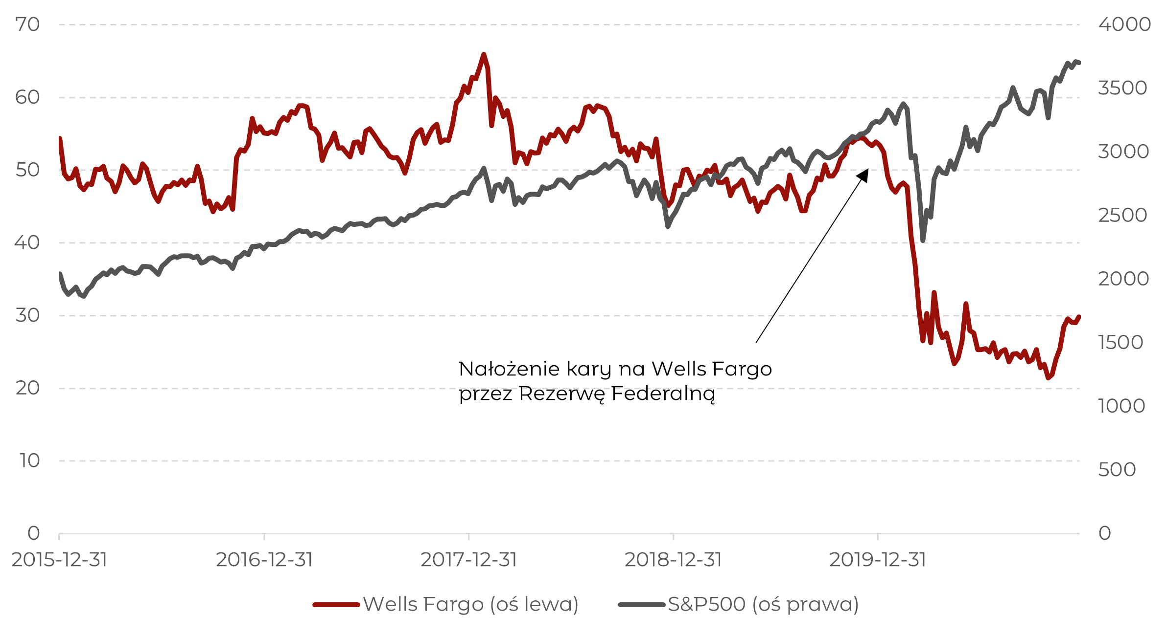 Wykres 5. Kurs akcji Wells Fargo i notowania indeksu S&P500 w latach 2016 – 2020.