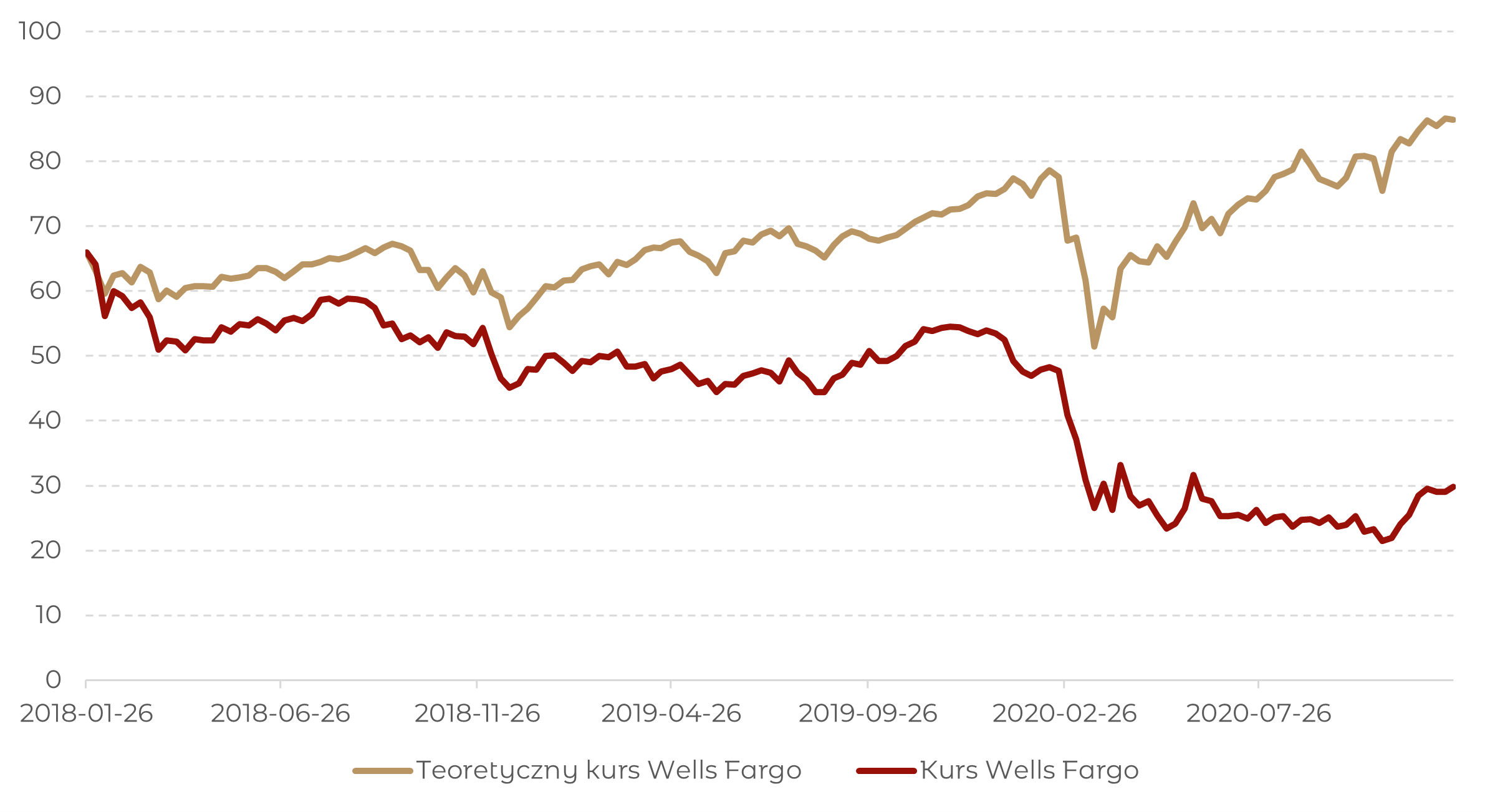 Wykres 6. Kurs akcji Wells Fargo i teoretyczny kurs akcji Wells Fargo (regresja względem S&P500) gdyby nie było nieprawidłowości.