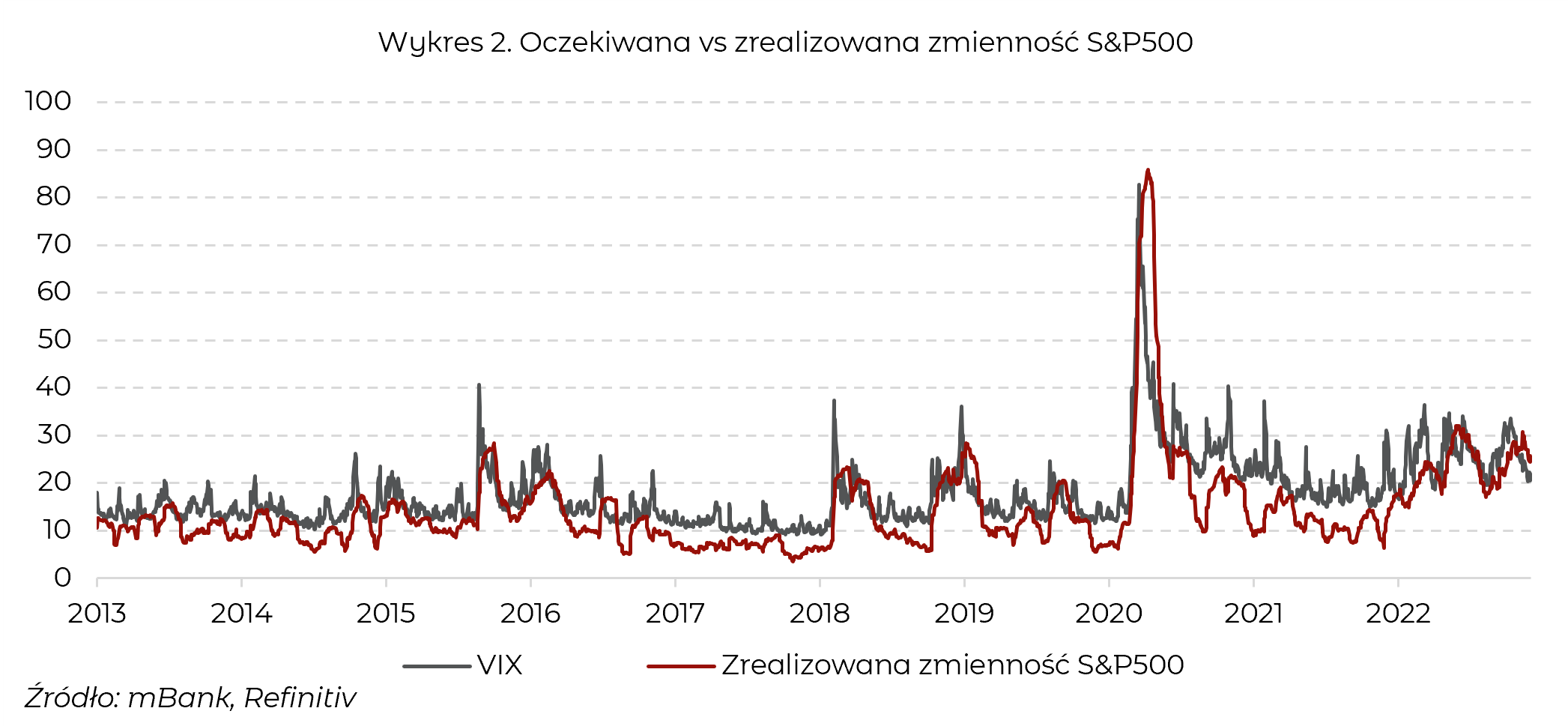 VIX pokazuje aktualne oczekiwania inwestorów oparte na obecnie posiadanej wiedzy. Nieoczekiwane zdarzenia mogą całkowicie odmienić sytuację. Pomimo niskiego poziomu indeksu zmienności dziś, w kolejnych 30 dniach możemy mieć do czynienia z ponadprzeciętnie wysoką zmiennością, jeśli okoliczności się zmienią. Zmienność to nie tylko eufemistyczne określenie spadków na rynkach finansowych. Najwyższy 30-dniowy wzrost indeksu S&P500 (+25%) został odnotowany na przełomie marca i kwietnia 2020 roku tuż po tym, jak VIX notowany był na poziomie 61,6 pkt. Z kolei najwyższy 30-dniowy spadek (-32%) miał miejsce miesiąc wcześniej, kiedy VIX był wciąż na umiarkowanym poziomie 14,4 pkt.