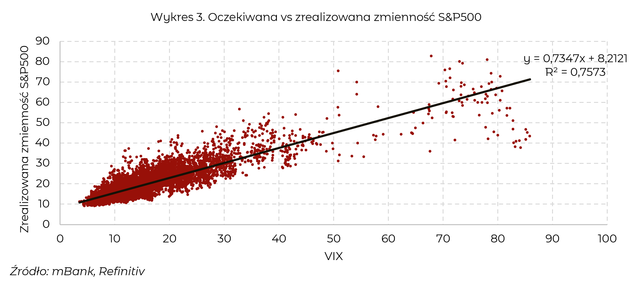Na wykresie 3 została przedstawiona relacja pomiędzy oczekiwaną zmiennością (VIX) a faktyczną zaobserwowaną zmiennością, która wystąpiła na amerykańskim rynku akcji od początku lat 90-tych. Na pierwszy rzut oka widać, że związek pomiędzy oczekiwaną i zrealizowaną zmiennością jest i do tego jest liniowy. Oczekiwanej niskiej zmienności zazwyczaj towarzyszy niższa zrealizowana zmienności. Ale to tylko historia, a jak powiedział Ch. Kattering „interesuję się przyszłością, bo w niej spędzę resztę życia“. Czy zatem na podstawie indeksu VIX da się przewidzieć przyszłość?
