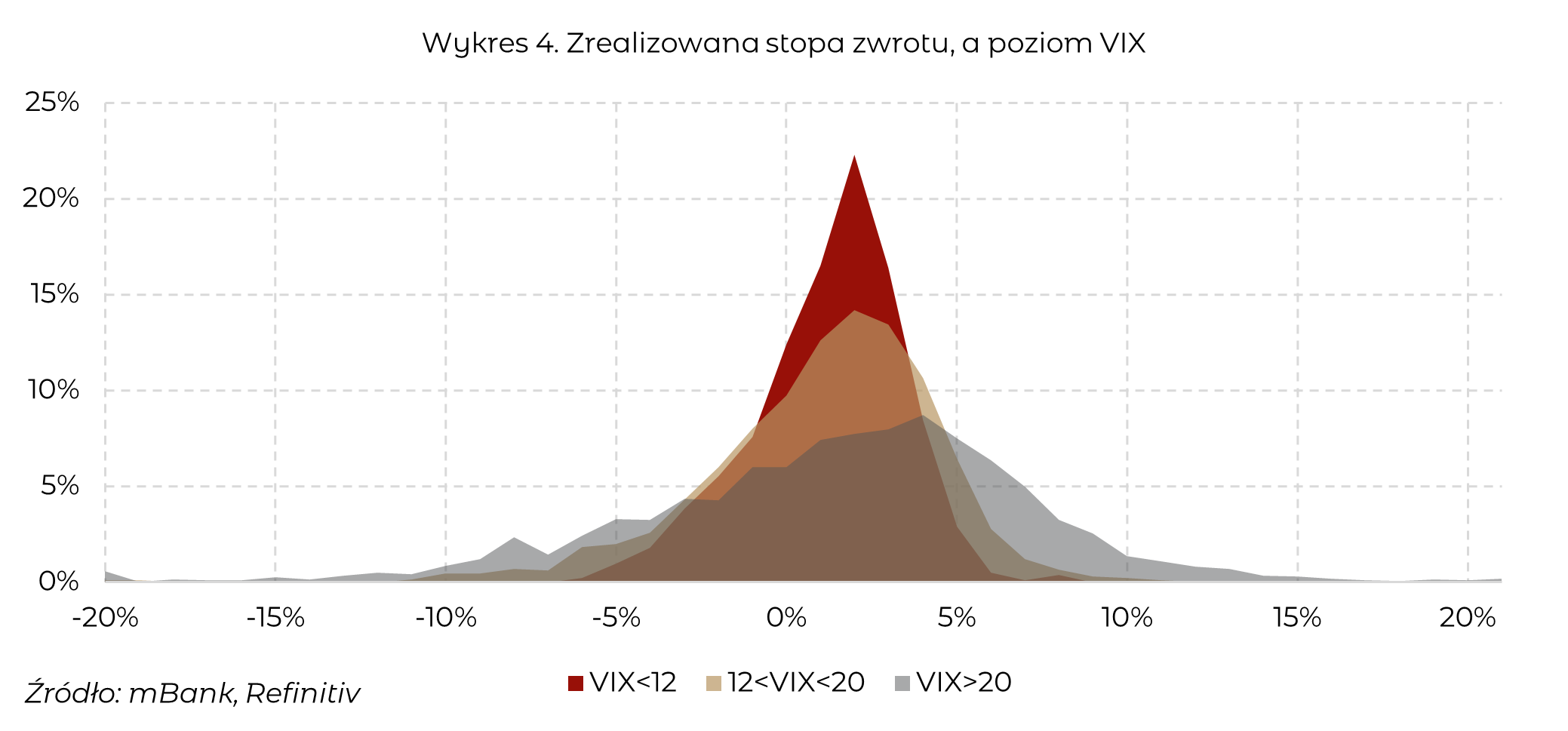 Patrząc na historię, indeks VIX przez większość czasu znajduje się na średnim poziomie, czyli powyżej 12 i poniżej 20. Przy tych średnich poziomach oczekiwanej zmienności w nieco ponad 60% przypadków stopa zwrotu z indeksu S&P500 za kolejne 30 dni znalazła się w przedziale -1% − 4%. Jest to również przedział, w którym, niezależnie od implikowanej przez VIX zmienności, najczęściej znajdowała się 30-dniowa stopa zwrotu z indeksu S&P500. Największa koncentracja stóp zwrotu występuje przy niskich poziomach VIX. W okresach niskiej oczekiwanej zmienności w ¾ przepadków stopa zwrotu znalazła się we wspomnianym wcześniej przedziale. Dla wysokich poziomów VIX udział ten wynosi nieco ponad ⅓. Im wyższy poziom VIX tym „grubsze” ogony, czyli większe rozproszenie stóp zwrotu i wyższa częstotliwość wyników ekstremalnych i to zarówno ujemnych, jak i dodatnich. Niezależnie od poziomu, na jakim znajdował się indeks zmienności, średnia stopa zwrotu w okresie kolejnych 30 dni wyniosła 0,7%, przy czym dla wyższej zmienności była nieco wyższa (1%). Patrząc na medianę, widzimy jednak, że to właśnie w okresach podwyższonej oczekiwanej zmienności jest ona najwyższa (1,6% dla VIX>20 i 1% dla VIX<20).