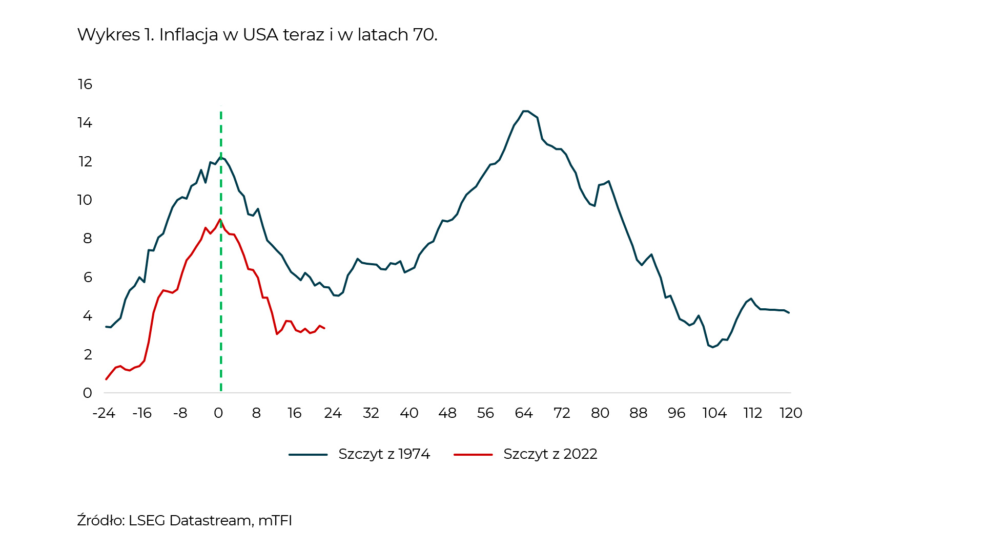 Wykres jest w miarę prosty. Bierzemy szczyt inflacji w USA z 1974 roku i patrzymy, jak inflacja zachowywała się 24 miesiące wcześniej i 120 miesięcy później. Na to nakładamy szczyt z połowy 2022 roku i mamy analogię. Ten wykres jednoznacznie sugeruje, że powinna być druga fala, prawda? I to dużo większa od tej pierwszej…