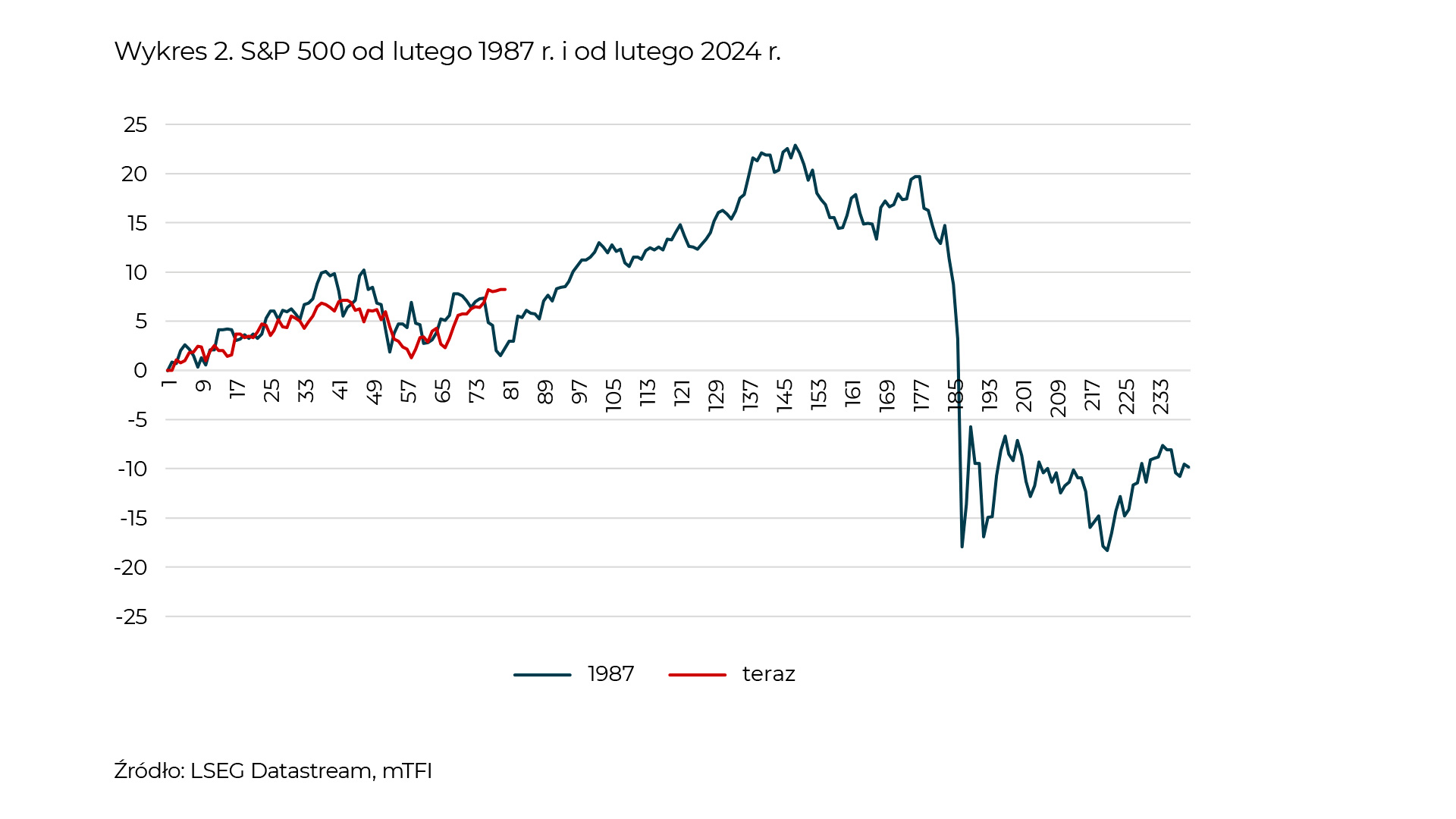 Skoro już pastwimy się nad prostymi analogiami, to chcielibyśmy zawczasu przypomnieć o jeszcze jednej. Otóż bardzo często nakładane są wyniki indeksu akcji (zwykle S&P 500 albo Dow Jones) na to, co działo się w 1987 roku. Mówi się, że wtedy też amerykańskie indeksy rosły, a potem przyszedł czarny poniedziałek. No to w kilka minut zrobiliśmy taki „przerażający” wykres, pokazując wynik amerykańskiej giełdy od lutego tego roku w zestawieniu z tym, co widzieliśmy właśnie w 1987 roku: