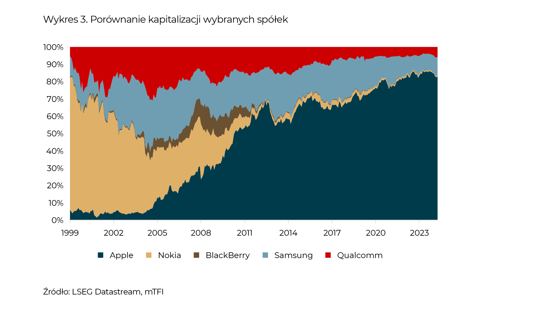 Opuszczamy teraz makroekonomiczne dywagacje o inflacji, żeby spojrzeć na to, co dzieje się w świecie AI. Nie będziemy mówić o kolejnych sukcesach Chat GPT-4o, ale o tym, co dzieje się w spółkach, które się tym zajmują. Najpierw jednak historyczne ostrzeżenie. Każda nowa rewolucyjna technologia ma swoich pionierów. Ale tak jak pierwsi zdobywcy odległych zakątków Ziemi często przypłacili swoją ciekawość zdrowiem lub życiem, tak wiele pionierskich firm nie daje rady utrzymać swojej pozycji na rynku. Weźmy przykład telefonów komórkowych. Na wykresie poniżej pokazujemy kapitalizację rynkową wybranych spółek w ostatnim ćwierćwieczu.