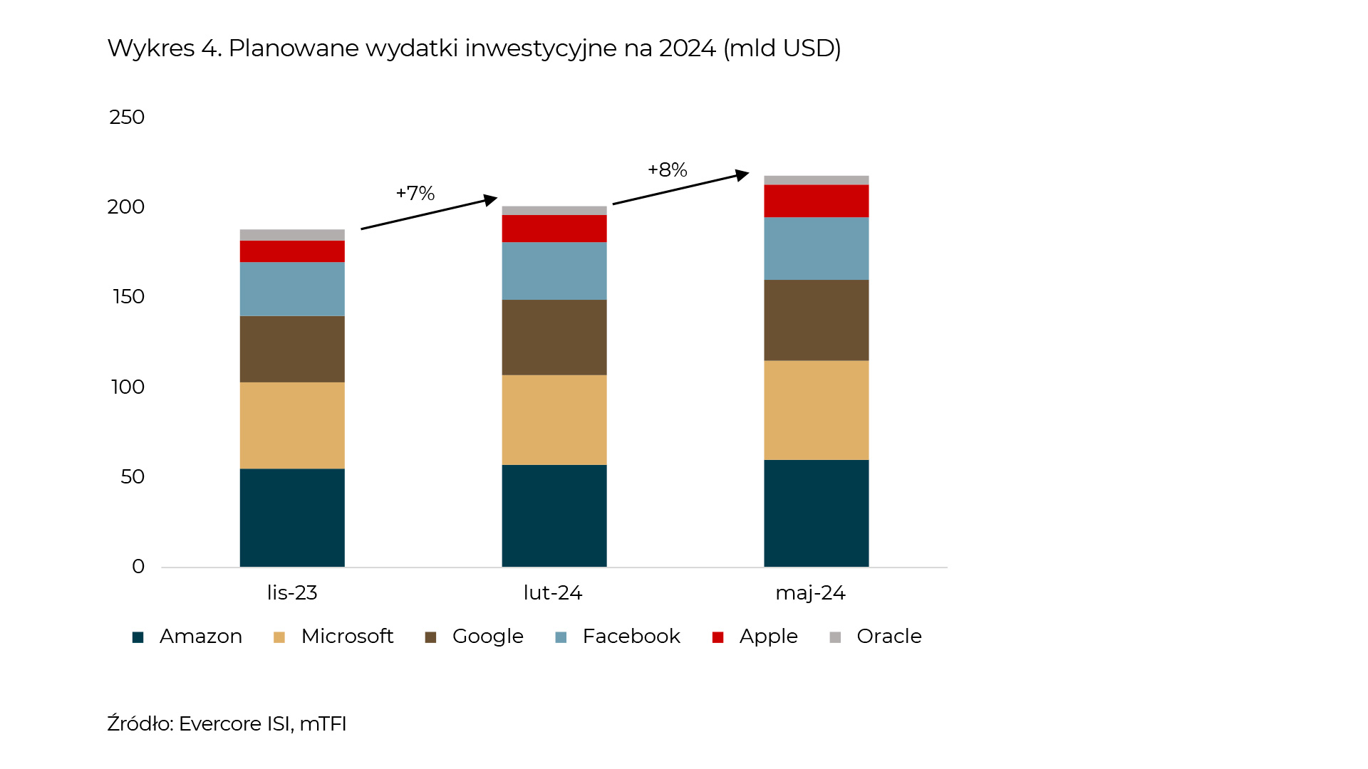 W listopadzie sześć wybranych spółek spodziewało się, że w całym 2024 roku wyda 188 mld dolarów. Mówimy tu głównie o wydatkach na infrastrukturę AI z produkowanymi przez Nvidię GPU na czele. W lutym tego roku prognozy zrewidowane zostały o 7% w górę i wartość przekroczyła 200 mld dolarów. W maju mieliśmy dalszą rewizję do prawie 220 mld. Prognozy przychodów są bardzo kapryśne, ale prognozy wydatków zwykle są bardziej rzetelne, bo odzwierciedlają realne kontrakty. Widzimy więc, że w AI są inwestowane faktycznie realne, potężne środki, których skala na razie tylko rośnie, co będzie się przekładać na wyniki spółek półprzewodnikowych. Dlatego, wydaje się, że ów mega trend w dalszym ciągu powinien być istotnie reprezentowany w portfelach, które charakteryzują się wysoką tolerancją na podejmowane ryzyko oraz długim horyzontem inwestycyjnym.