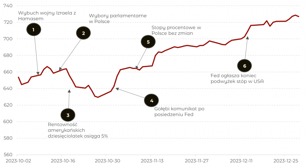 Wykres 1. Notowania globalnych akcji oraz najważniejsze wydarzenia rynkowe w IV kwartale 2023 roku.