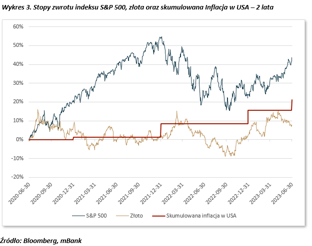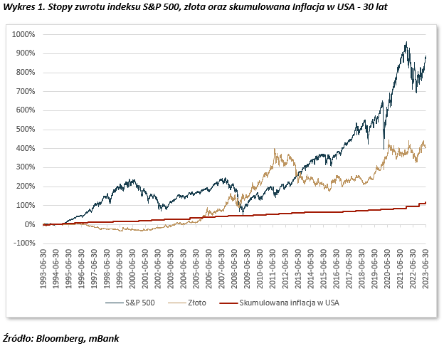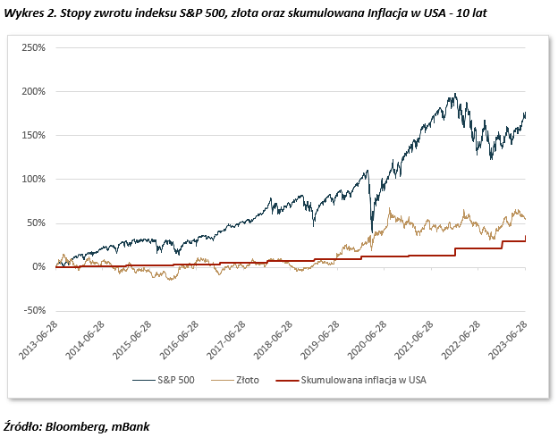 Wiemy, że temat złota nie jest tak powszechny w okresie spadającej dynamiki wzrostu cen, jednak rozliczmy się z historią, wróćmy do tytułowego wątku i weźmy ponownie “na warsztat” notowania złota w różnych horyzontach czasowych. Jako jego konkurenta wybraliśmy klasę aktywów, która w długim terminie ma porównywalną zmienność, jednak zachowuje stabilniejszy trend. W naszej ocenie jest tym samym bardziej słusznym wyborem jako element do długoterminowej alokacji w portfelach inwestycyjnych. Konkurent ten to indeks największych amerykańskich spółek S&P 500. Dodajmy do tego jeszcze skumulowaną inflację z USA, która przez ostatnie lata elektryzowała inwestorów. Zwróćmy jednak uwagę, że w długich terminach 30 lat czy 10 lat, skumulowana inflacja osiągająca poziom odpowiednio 120% i 35% nie stanowi wyzwania dla wyżej wspomnianych konkurentów.